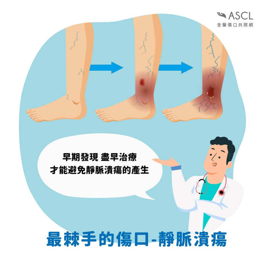 一旦出現靜脈潰瘍,及早的處置和適當的照護是關鍵: