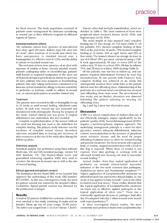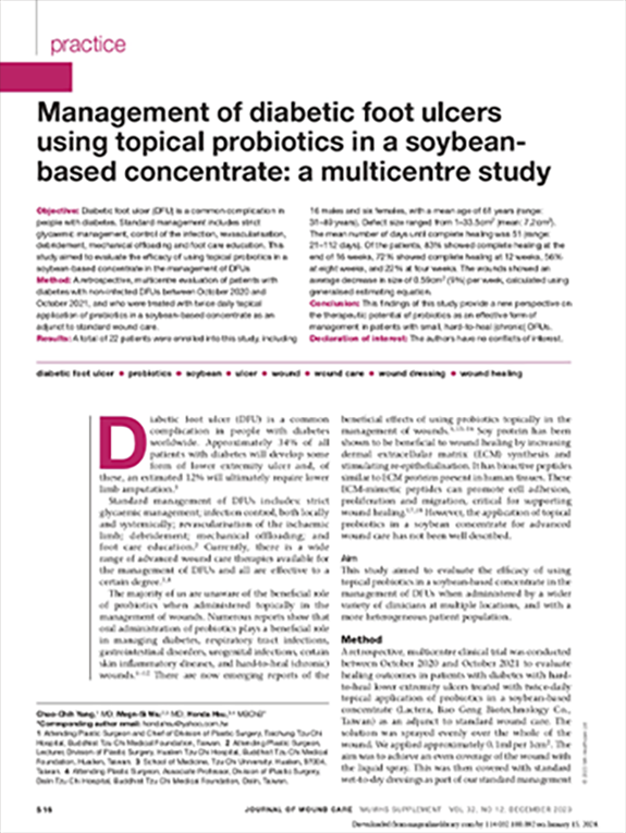 這是一篇發表在《Journal of Wound Care》的臨床研究,評估使用含益生菌的大豆基質塗劑作為輔助治療對糖尿病足潰瘍的管理效果,結果顯示傷口大小逐步減少且癒合率提升。
